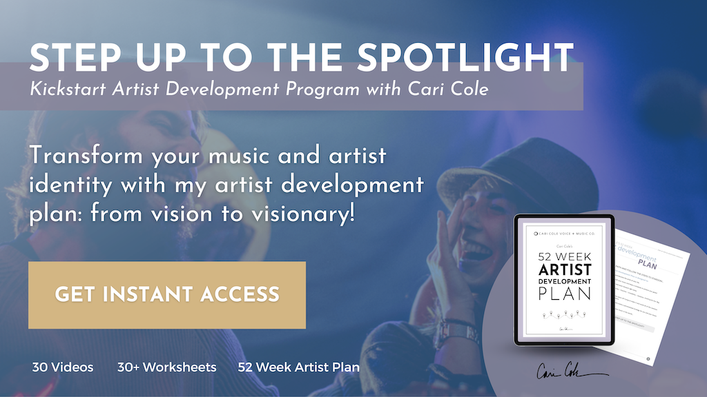 This blog is a starting point in the right direction. To get started putting all of these pieces in place, get my full Artist Development Plan here in my Step Up to the Spotlight Kickstart Artist Development self-study program. Click here to learn more.