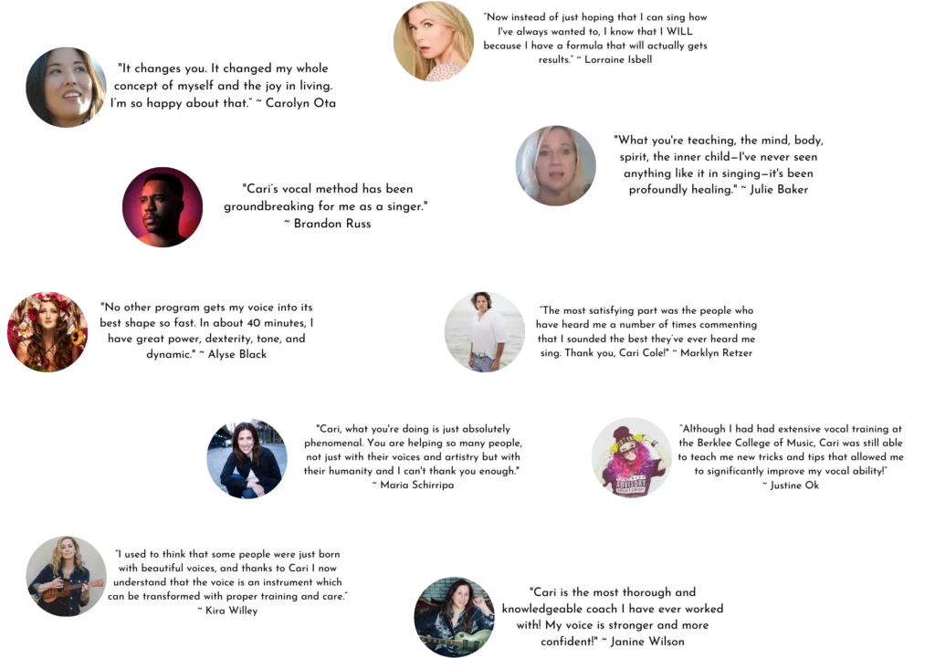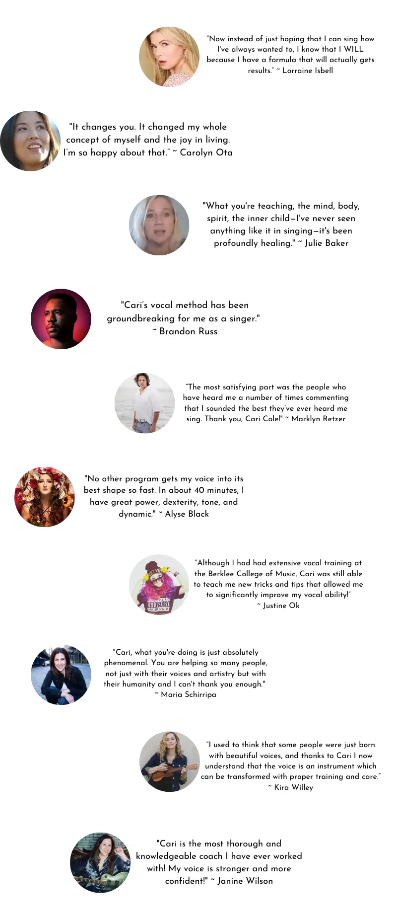 The Better Voice Challenge is a FREE 4-Day Vocal Training recorded Live that is now available for replay. Over the course of these 4 1-hour workshops you’ll be led by Celebrity + Holistic Vocal Coach, Cari Cole through the Cole Vocal Method release sequences to unlock your voice and increase power and sound using simple, effective Biomechanics and techniques based in vocal science.