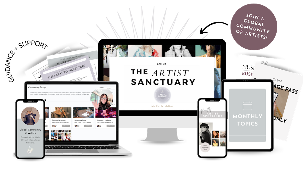 Come join our Artist Sanctuary Membership to get in our community where we help artists build their brands and grow their business. Our community is filled with artists of all genres, ages, backgrounds and levels of experience. Experience the power of music masterminds, group coaching calls, and more. Learn more here.